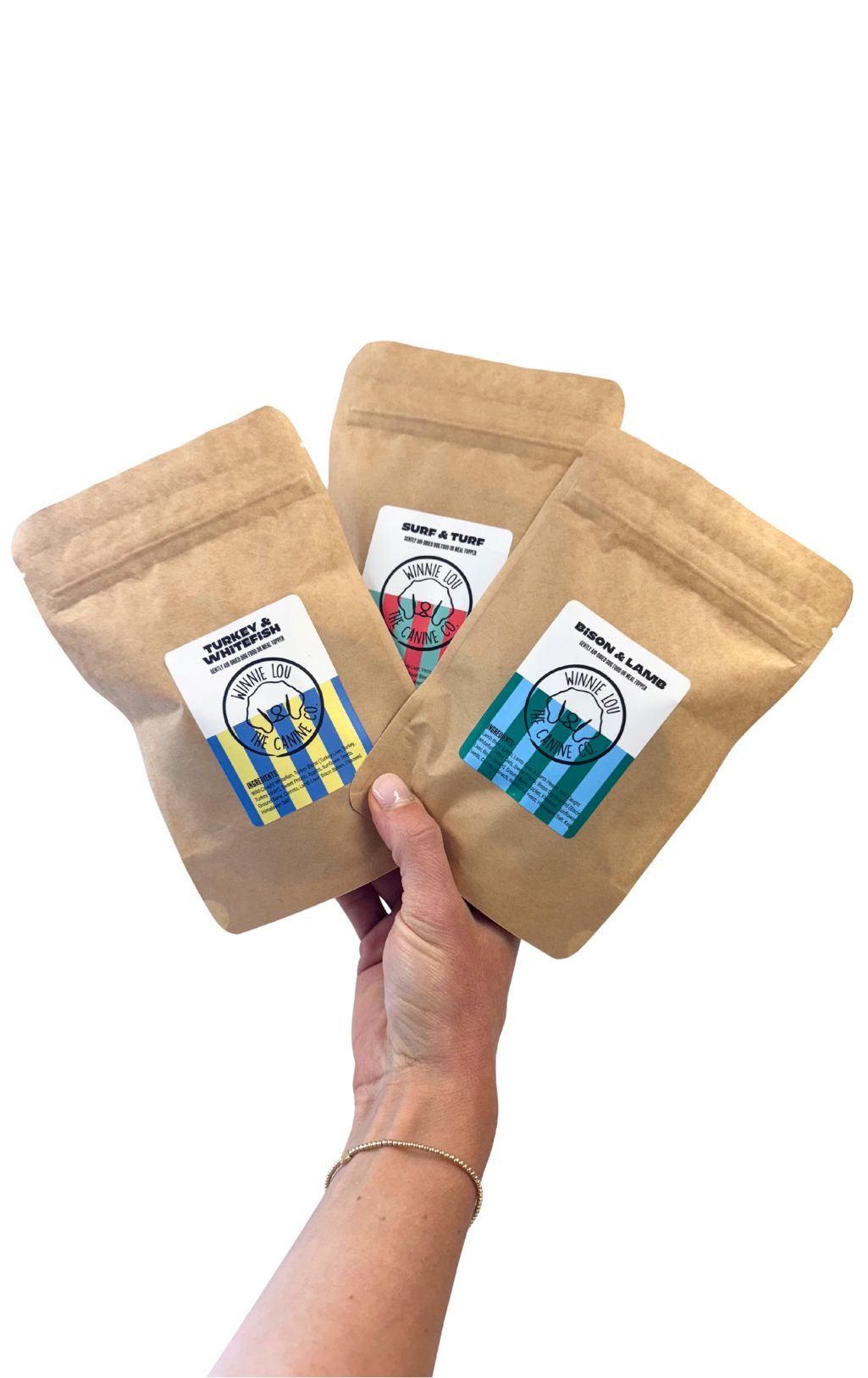 Winnie Lou's new, gently air-dried dog food is HERE!! We've been dreaming and researching and developing these recipes for over 2 years and cannot wait for your pup's to enjoy!!